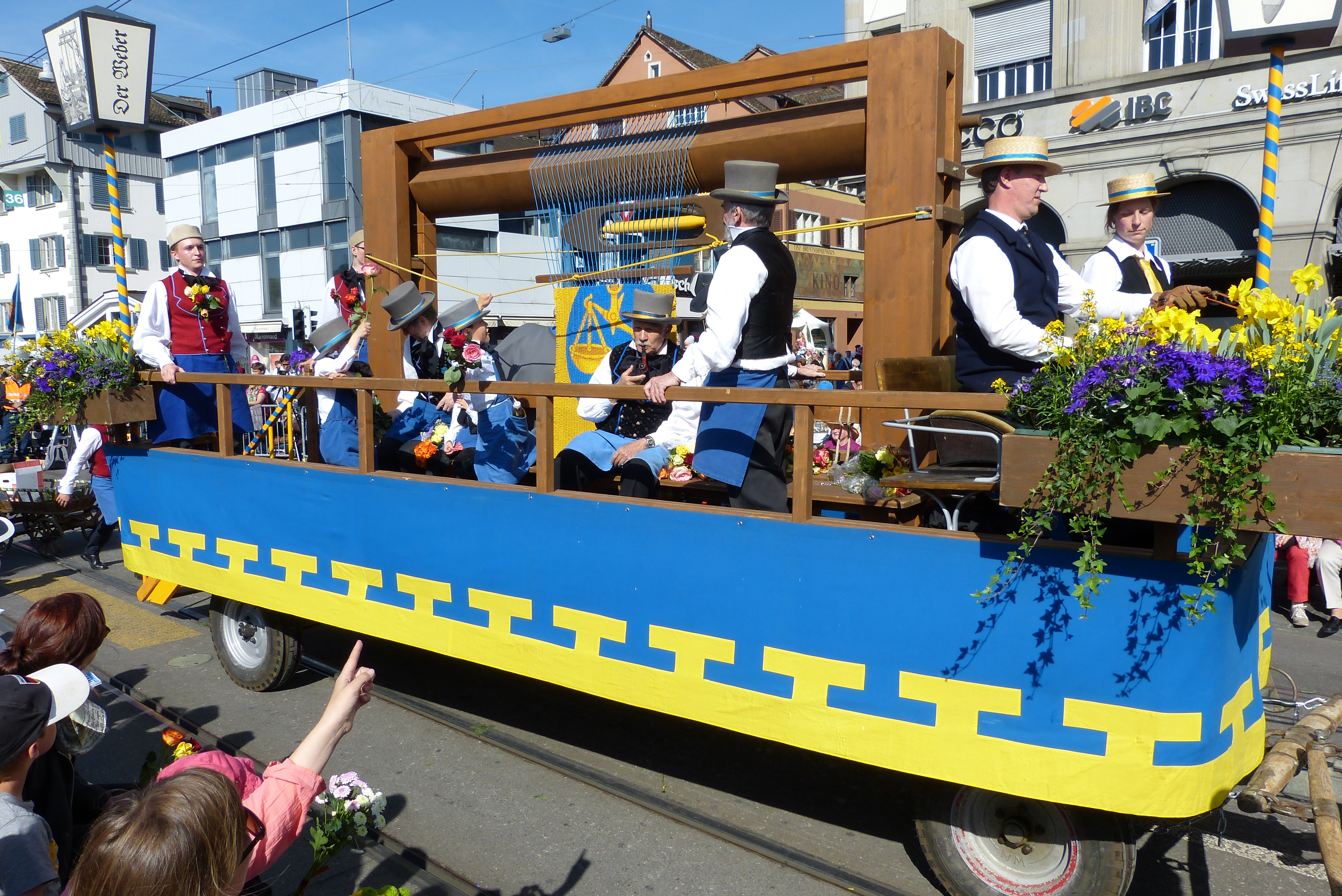 Der Webstuhlwagen zeigt das Handwerk des Webers. Im Webstuhl saust ein Webschiffchen hin und her und webt das feine Tuch.